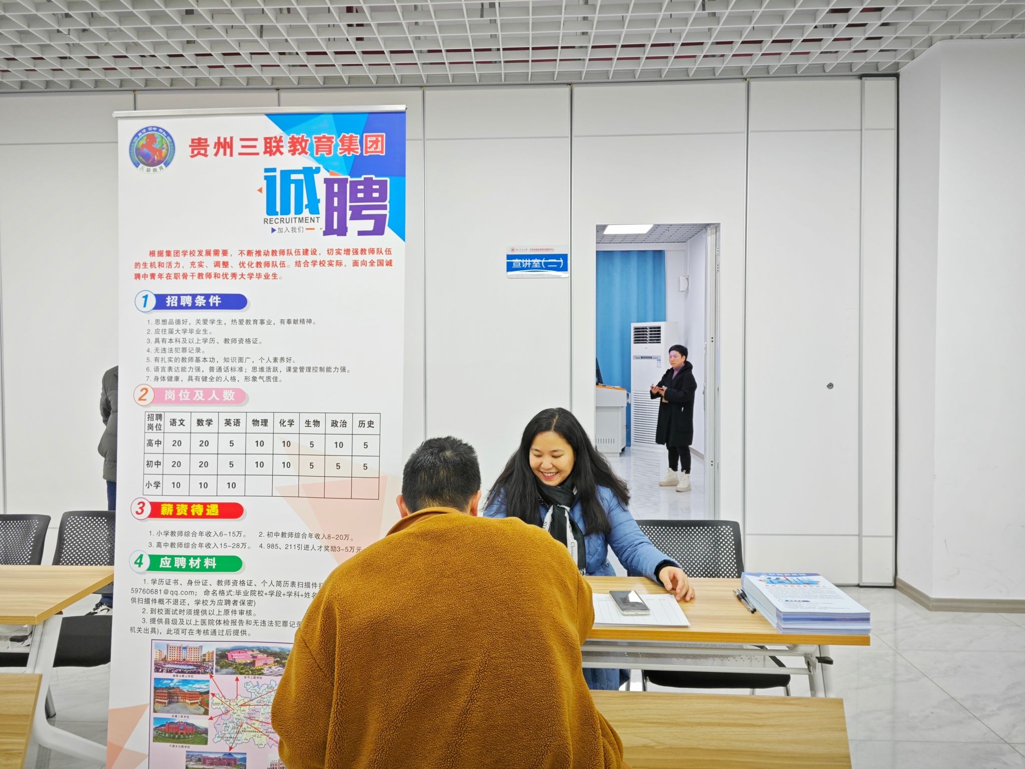 此次招聘会共邀请到了长水教育集团、贵州三联教育集团、遵义建国中学、广东茂名杨梅公司、三都高平凤凰实验公司等34家用人单位前来引才,提供了涵盖多个学科专业领域的200余个就业岗位。尽管天气寒冷,但招聘会现场气氛热烈,吸引了大量毕业生前来应聘。各用人单位展位前人头攒动,同学们手持精心准备的自荐书和简历,积极与意向单位交流,详细咨询招聘信息。用人单位则通过集中宣讲、展示宣传海报和面对面座谈等方式,详细介绍企业文化、薪资待遇、岗位需求等情况,耐心解答同学们的疑问。各公司还为用人单位提供了试讲和面试场地,确保招聘活动顺利进行。