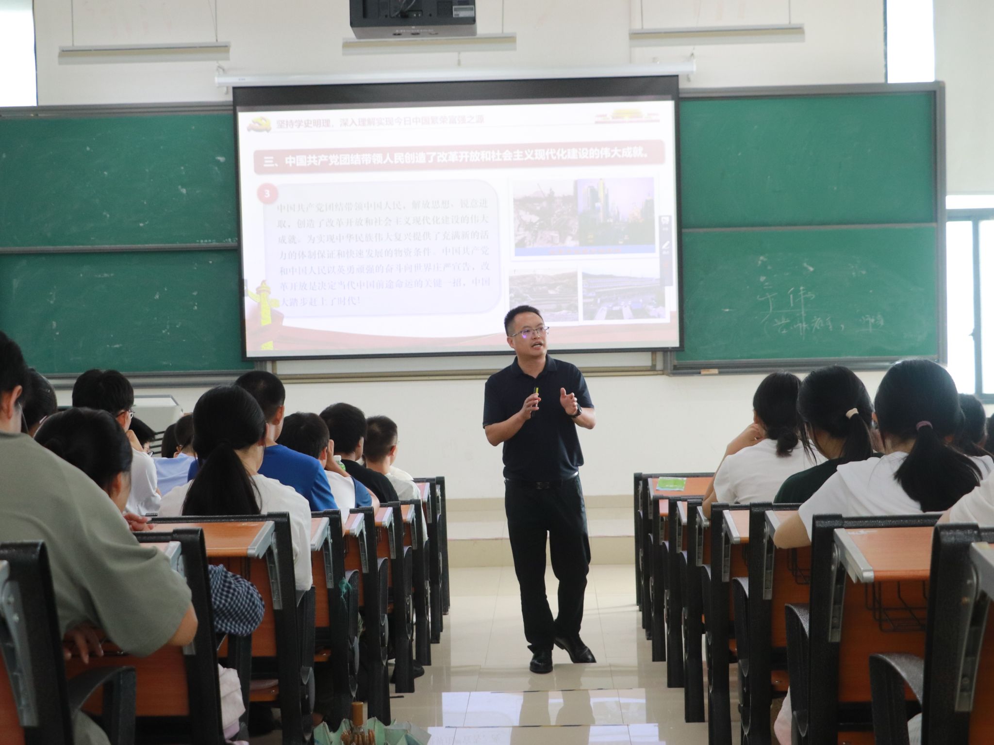 孙谦从“坚持学史明理,深入理解实现今日中国繁荣富强之源”“坚持凝心铸魂,积极凝聚推进强国复兴伟业精神之力”“坚持自立自强,不断增强推进强国复兴伟业服务之能”“坚持感恩奋进,自觉肩负推进强国复兴伟业青年之责”等维度,引导同学们深刻认识中国共产党团结带领中国人民创造的伟大历史成就,深刻理解中国共产党一经成立就确立了为中国人民谋幸福、为中华民族谋复兴的初心使命。他希望同学们自觉学习贯彻习近平新时代中国特色社会主义思想,继承和弘扬好社会主义先进文化和中国精神,以实际行动向英雄模范人物学习,努力将自己锻造成为有理想之人、有本领之人、敢担当之人、能吃苦之人、肯奋斗之人。他希望同学们要自觉肩负时代使命,切实做到坚定理想信念,时刻校准报效祖国、服务人民的人生坐标;坚守初心使命,积极投身强国建设、民族复兴的伟大实践;坚持自我革新,持续增强能担重任、堪当大用的本领才干。最后,他引导同学们要积极向党靠拢,在党组织的培养下健康成长成才。
