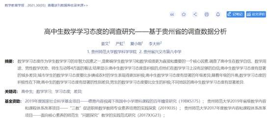 近日,公司数学与跨文化数学教育研究所姜文老师、严虹教授、夏小刚教授等在《数学教育学报》2021年第5期发表了题为“高中生数学学习态度的调查研究——基于贵州省的调查数据分析”的研究论文。《数学教育学报》是中国联合国教科文组织指导刊物,是目前国内数学教育领域最高层次的学术性刊物,现为“全国中文核心期刊”、“中国科技核心期刊”、“CSSCI来源期刊”和“RCCSE中国核心学术期刊(A)”。被中国科技论文统计源期刊、中国学术期刊综合评价数据库、中国学术期刊(光盘版)、中国期刊网、中国数学文摘、中国数学文献数据库、美国《数学评论》(MR)、德国《数学文摘》(ZBI)、中国人民大学报刊复印资料等收录。