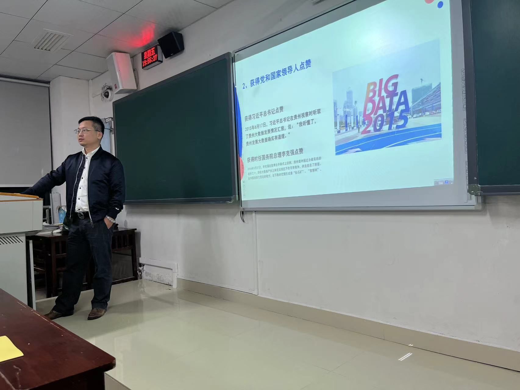 讲座伊始,程主任谈及2013年贵州"起点抢跑"数字经济"新赛道",由贵州茅台到电解铝的转型故事,提高了同学们对本次讲座的兴趣。然后,程主任介绍了贵安新区大数据产业发展实现从无到有,在落地生根,继而风生水起的精彩"三级跳"。最后,程老师肯定了应用统计专业和信息与计算机专业对大数据所起的关键性作用,向同学们介绍了大数据基地,并建议同学们有时间可以去参观学习。